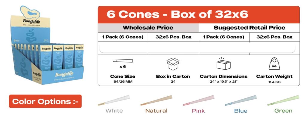 We sell Pre-Rolled Cones(in over 5 colors). Premium Tea Leaf Blunts, Flavoured Rolling papers, Rolling Paper booklets, Roach books, Comby books etc.