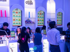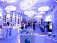The shop transports the customer into a state of nirvana as clouds float from the ceiling, with walls draped in sheer white curtains that double as backdrops for precision image mapping.